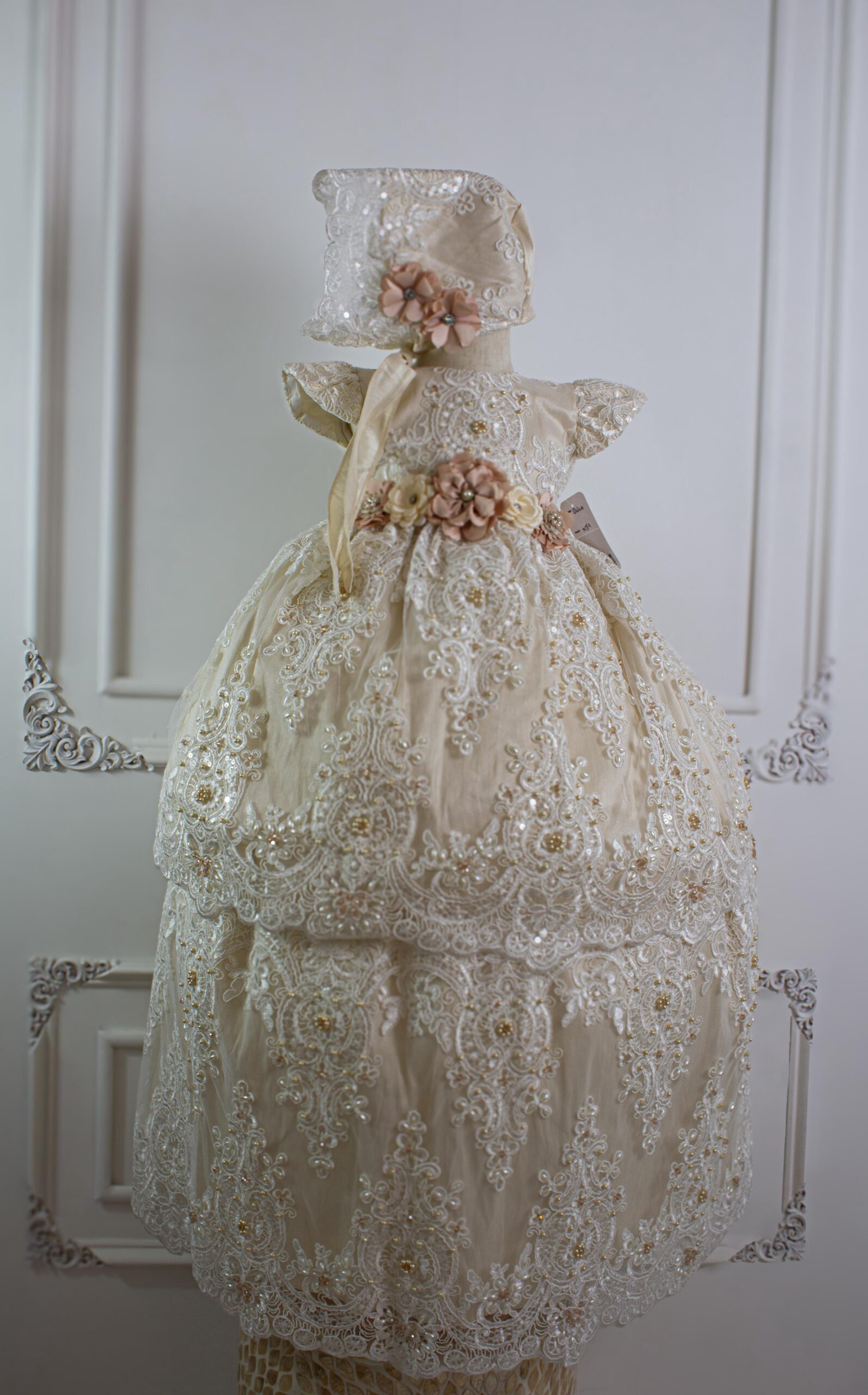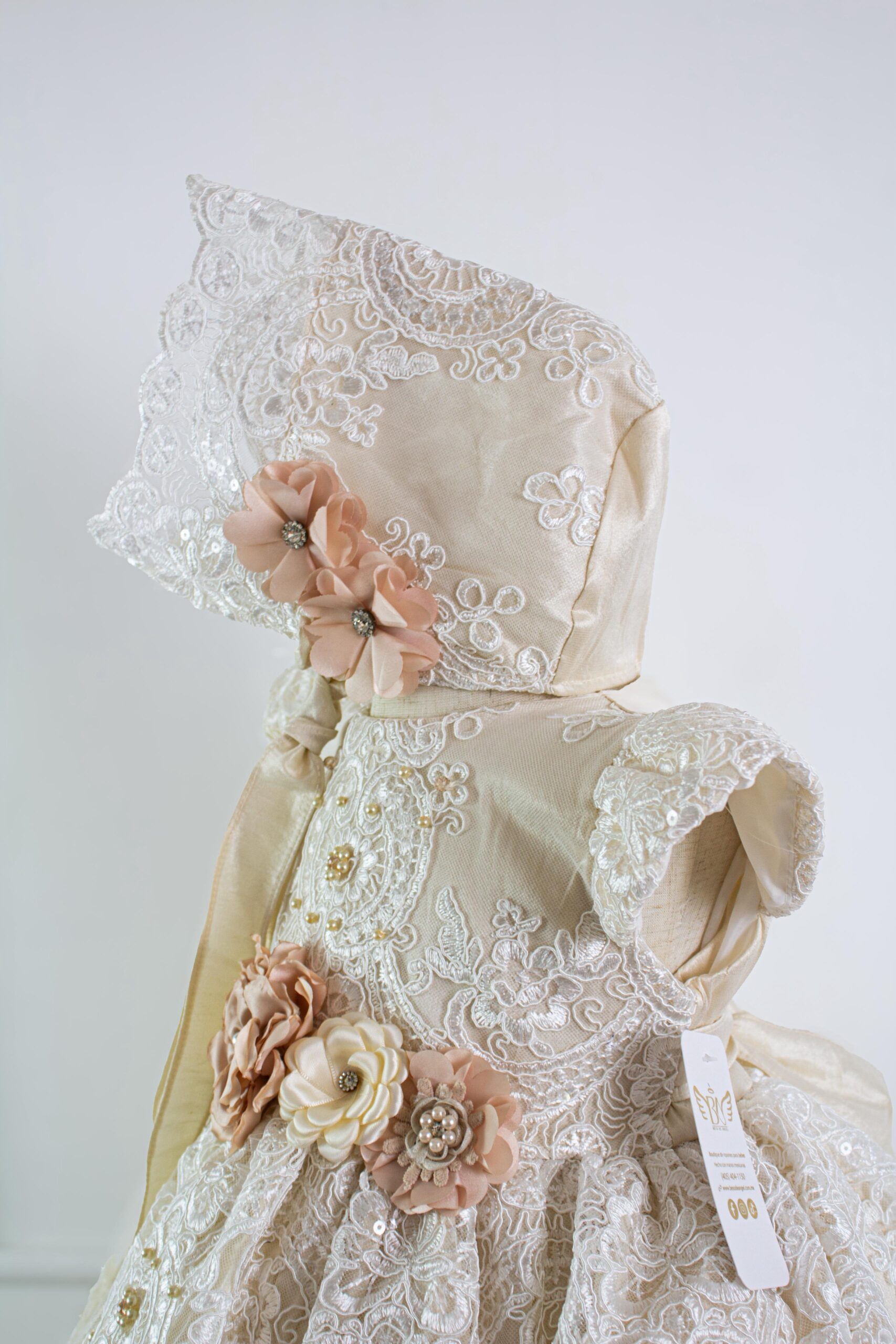 Un ropón de bautizo de lujo con un tono cálido y una textura inigualable. La riqueza del encaje y los detalles dorados lo convierten en una pieza verdaderamente majestuosa y digna de un día inolvidable.