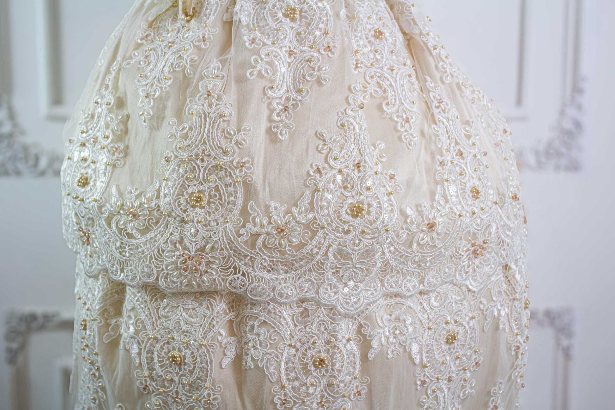 - Material: Confeccionado en un tejido base en tono champaña o dorado suave, recubierto por un elaborado encaje floral blanco o marfil que contrasta elegantemente. El encaje está adornado con hilo dorado, pequeñas perlas y lentejuelas.