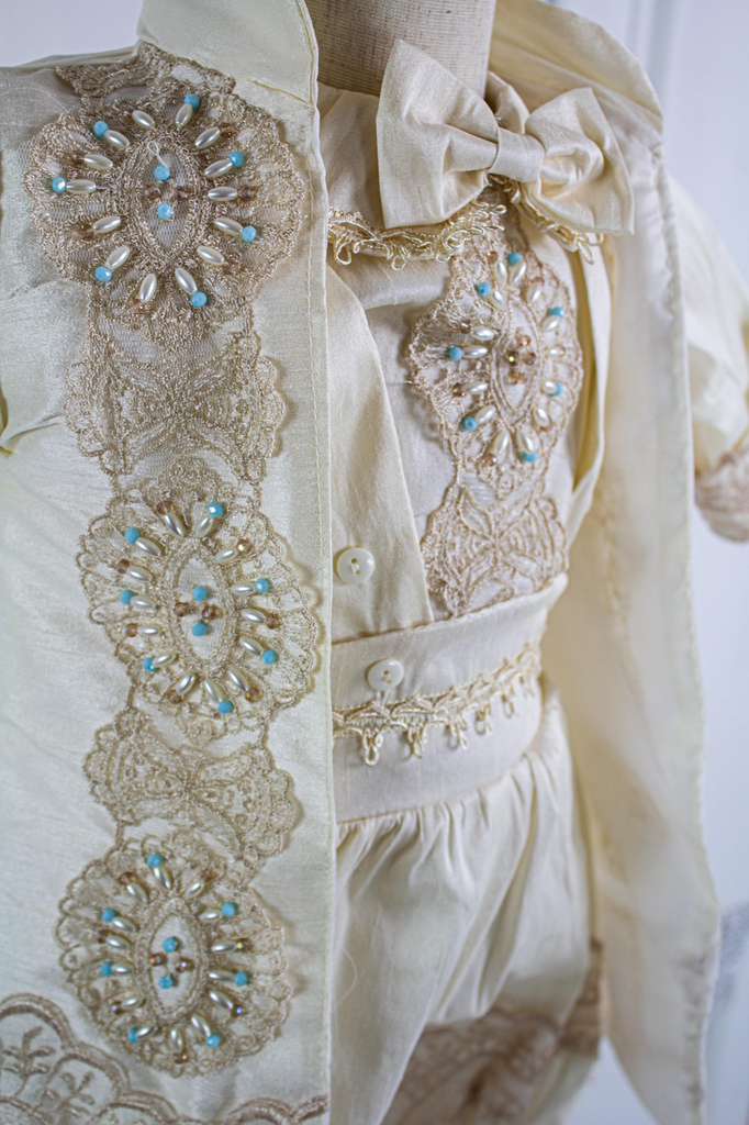 Material: Confeccionado enteramente en un satín sedoso de tono marfil o crema pálido. Presenta un elaborado trabajo de bordado de hilo dorado y beige claro en los ribetes, el fajín, los puños y los pantalones. La chaqueta se decora con aplicaciones de pedrería en tonos turquesa claro y diamantes de imitación que añaden destellos.