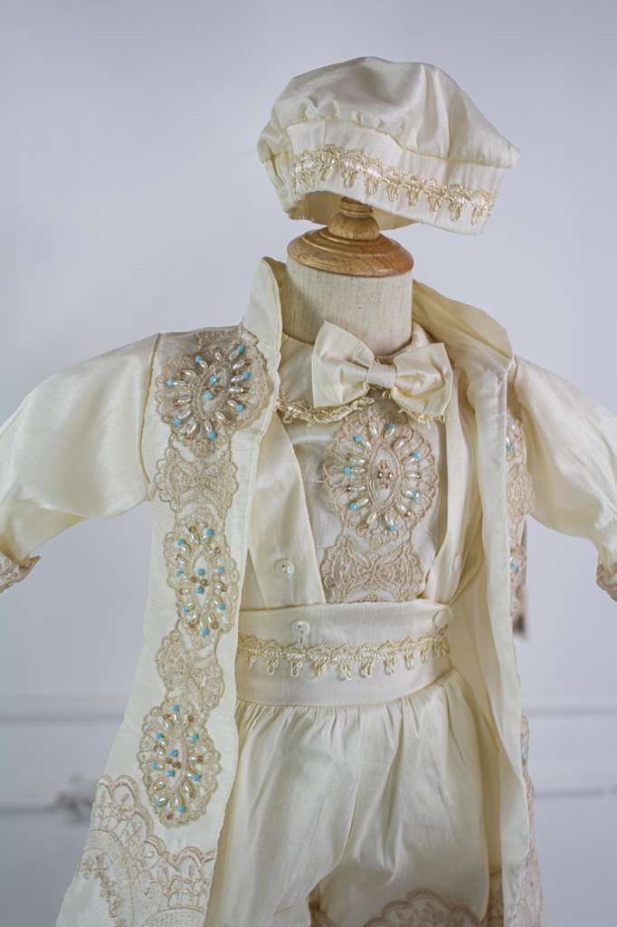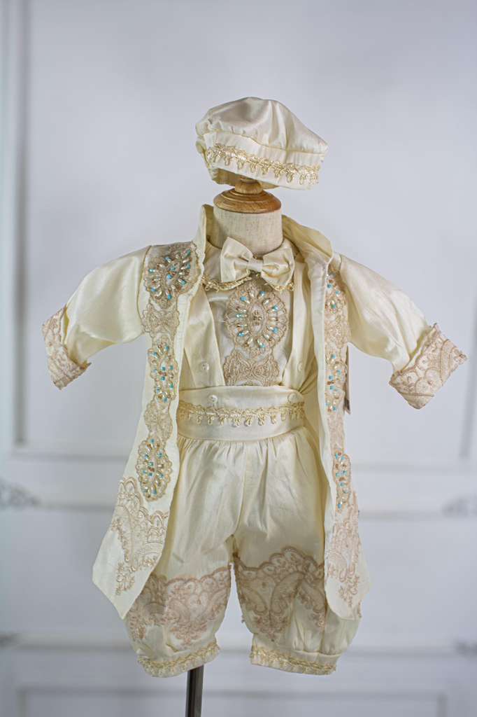 Un conjunto de bautizo o ceremonia que irradia una opulencia serena y clásica. La combinación de satín color marfil con bordados dorados y sutiles toques de color crea una pieza de diseño regio y atemporal.
