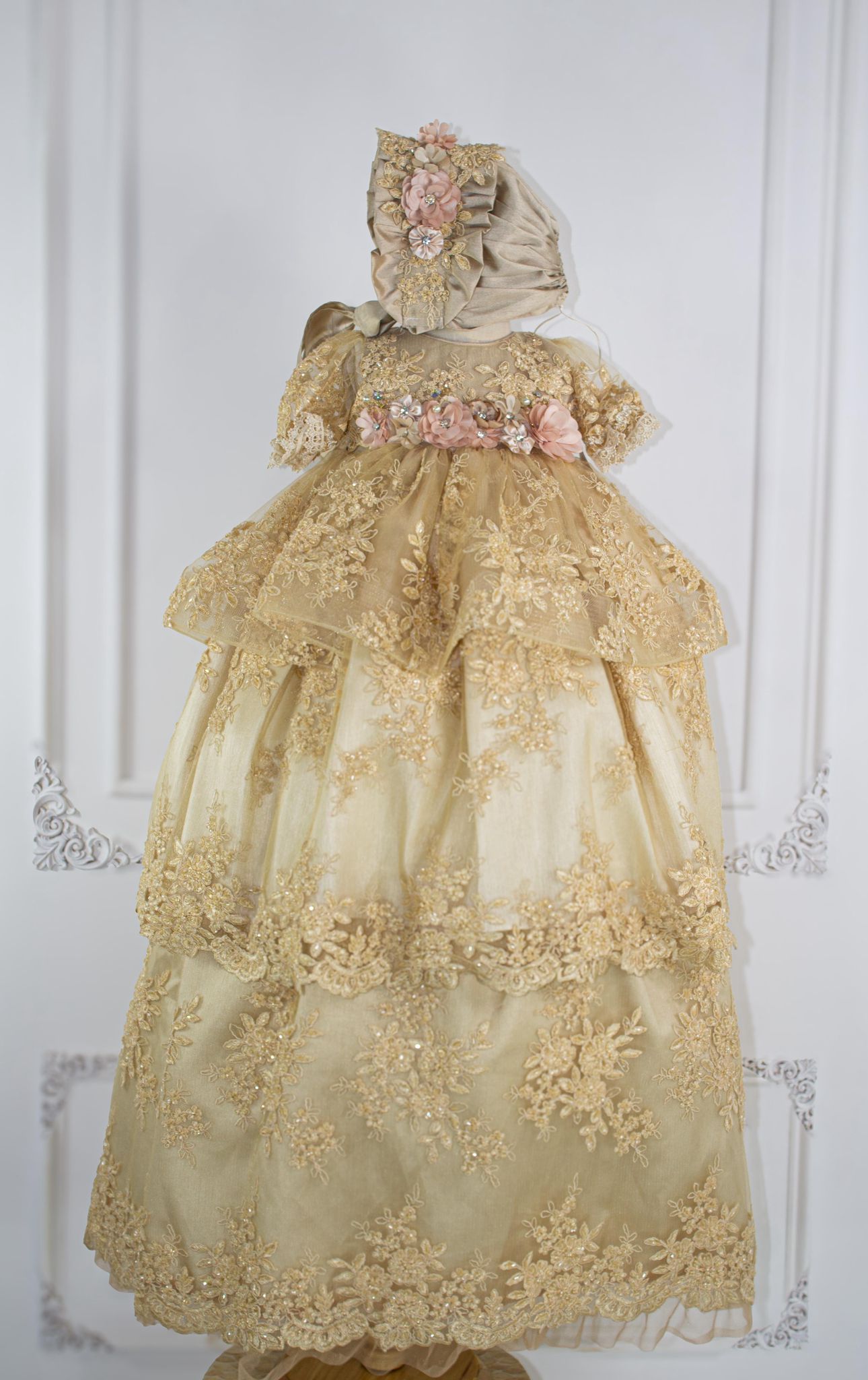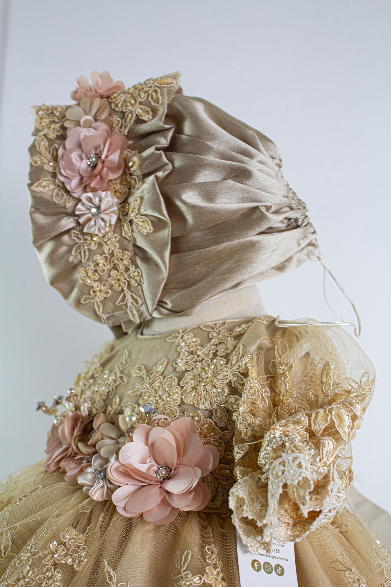 - Material: Confeccionado en tela de alta calidad en un hermoso tono oro viejo o champaña, completamente cubierto con un rico encaje floral tridimensional y sutiles pedrerías doradas.