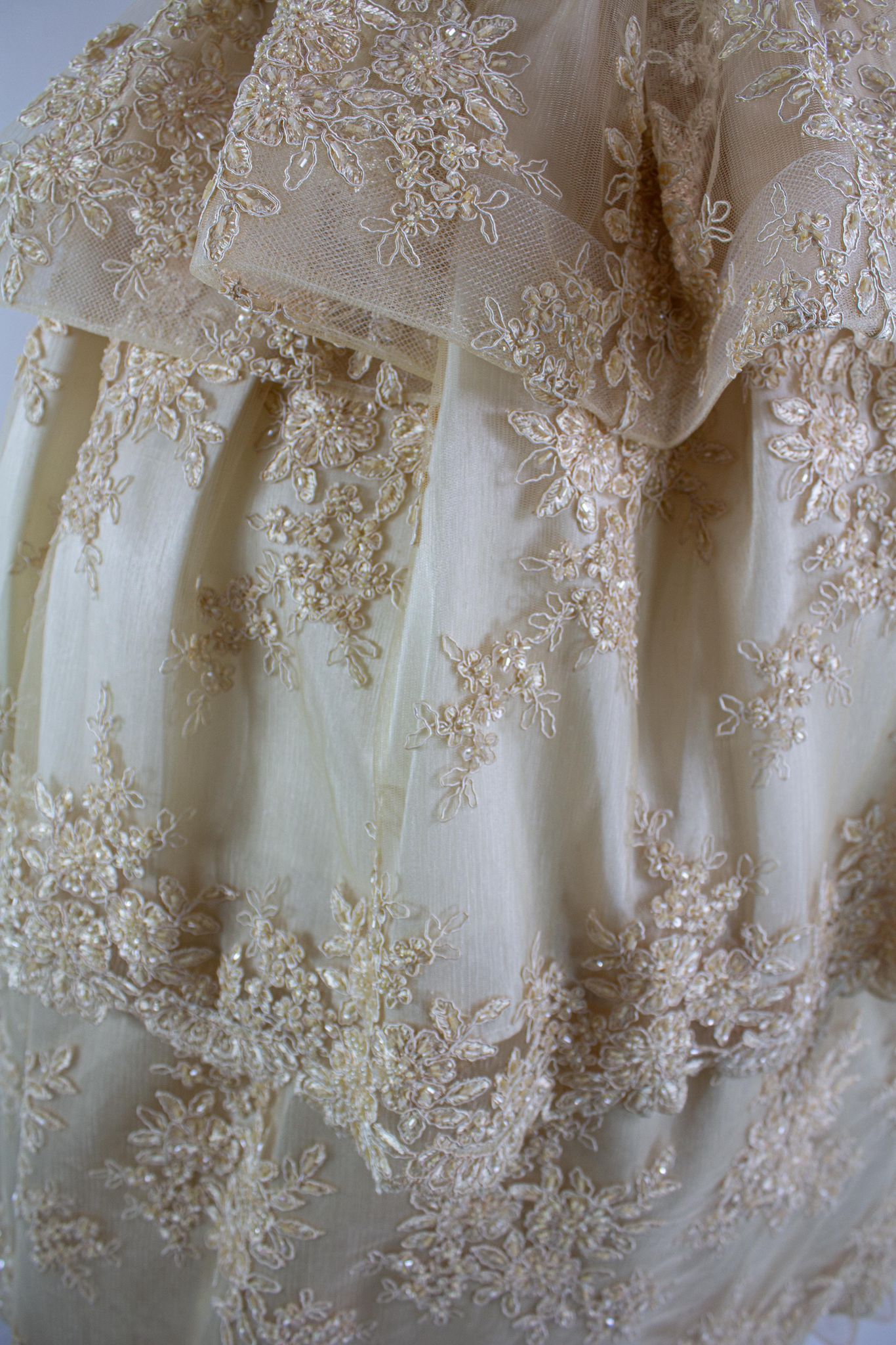 - Estilo: Corte clásico de gala con un faldón largo y tres niveles escalonados que proporcionan un volumen y una caída imponentes. La manga corta está adornada con el mismo encaje.