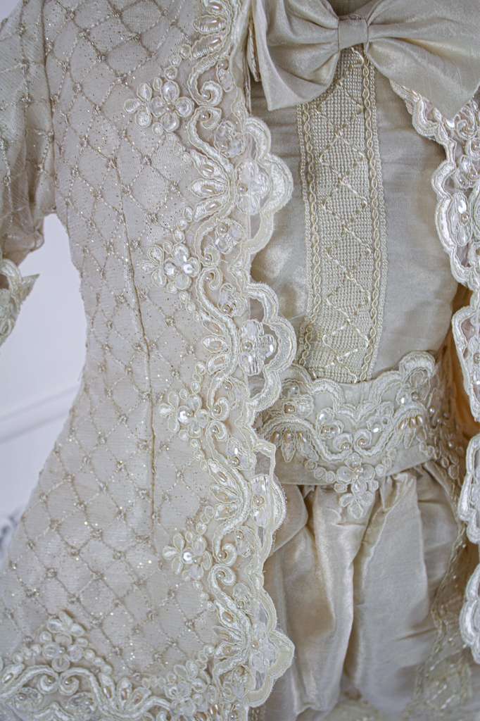 Adornos: La chaqueta y el fajín están densamente adornados con encaje festoneado, perlas y lentejuelas transparentes que delinean los bordes y los patrones. La pechera de la camisa presenta un panel central de cintas o pasamanería. El conjunto se completa con una pajarita de satín a juego, que añade un acabado limpio.