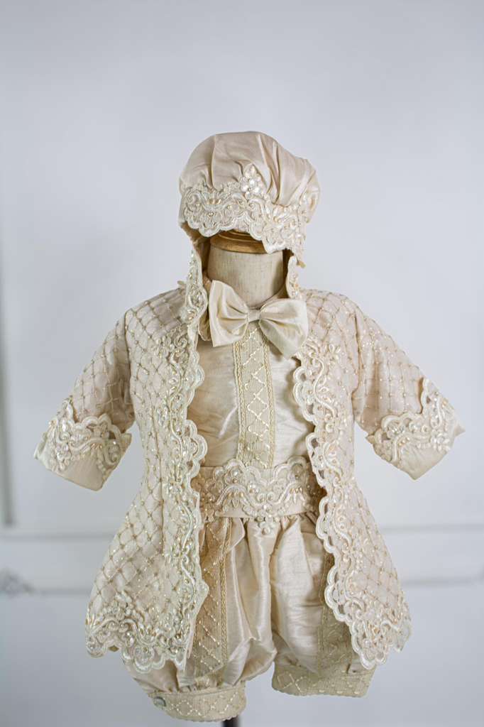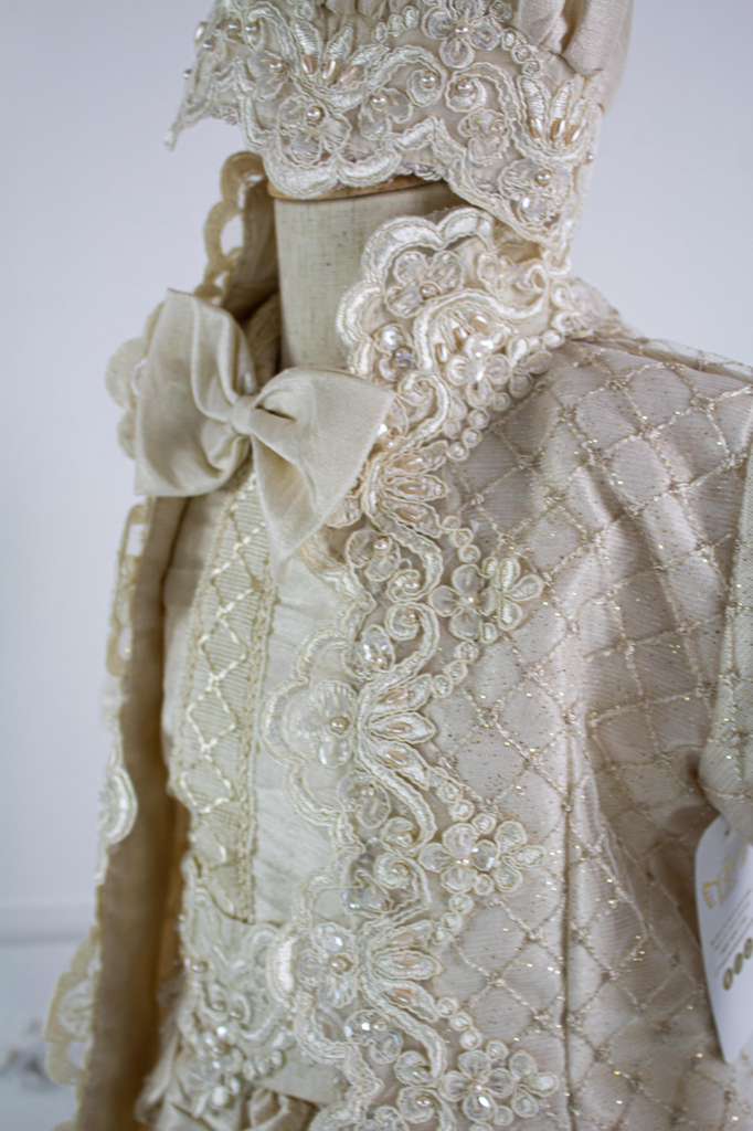 Un deslumbrante traje de bautizo que evoca la opulencia de la época victoriana en su versión más delicada y ceremonial. La profusión de brillo, encaje y texturas acolchadas en un solo tono crea una pieza de gran impacto visual.