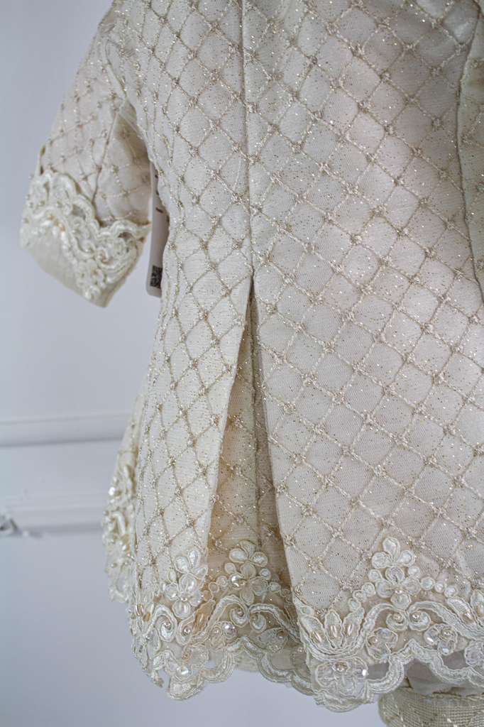 Material: Confeccionado enteramente en un tono champaña, marfil o crema muy pálido, utilizando un tejido satinado para el pantalón y la camisa. La chaqueta es de un tejido más pesado que presenta un patrón de acolchado, cubierto con un trabajo de bordado y lentejuelas que le da un brillo general.