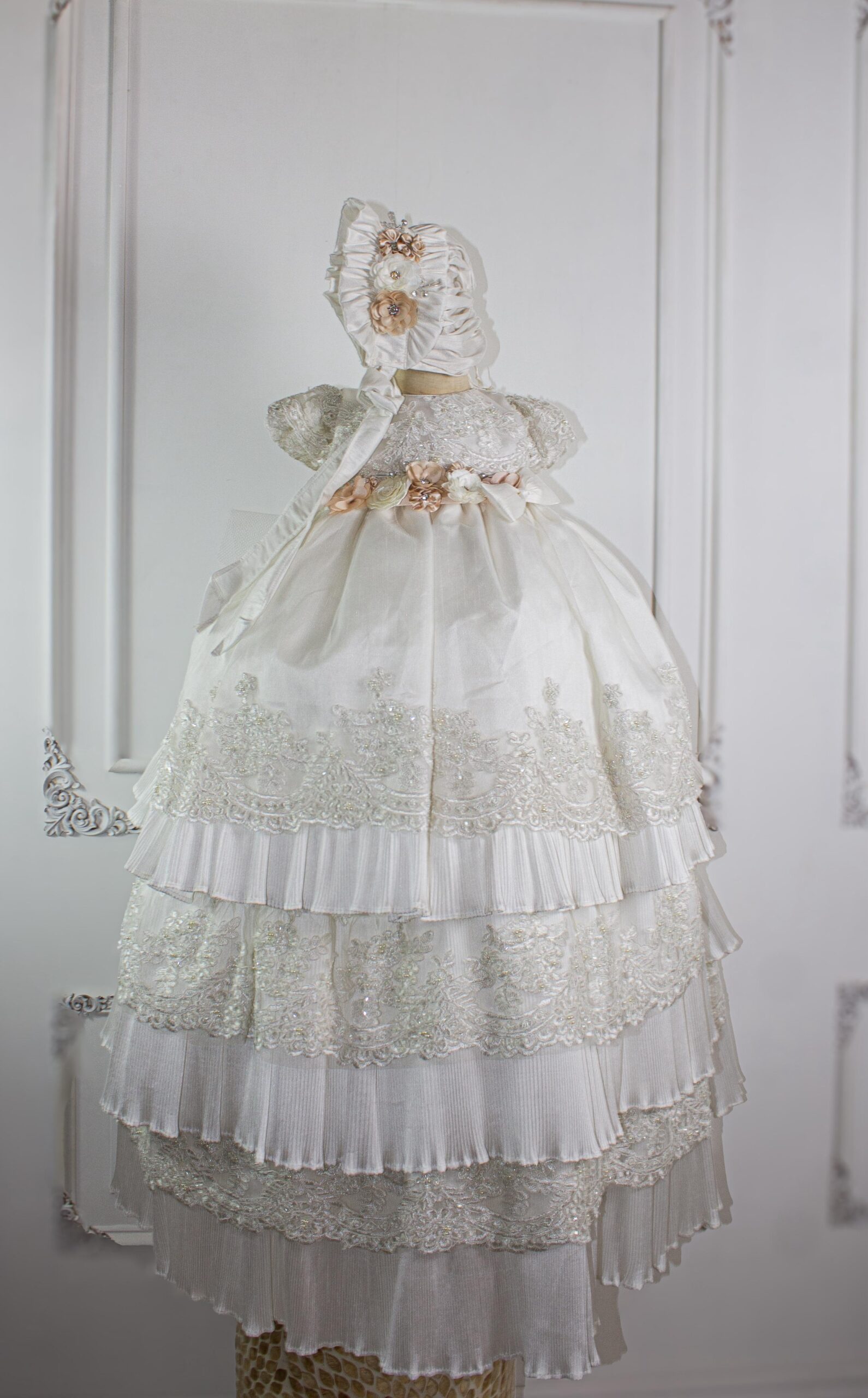 Un ropón de bautizo de estilo principesco y deslumbrante, que fusiona la tradición con un brillo delicado. La combinación de capas de volantes y apliques de encaje con lentejuelas o cuentas crea un efecto luminoso y de gran riqueza visual.