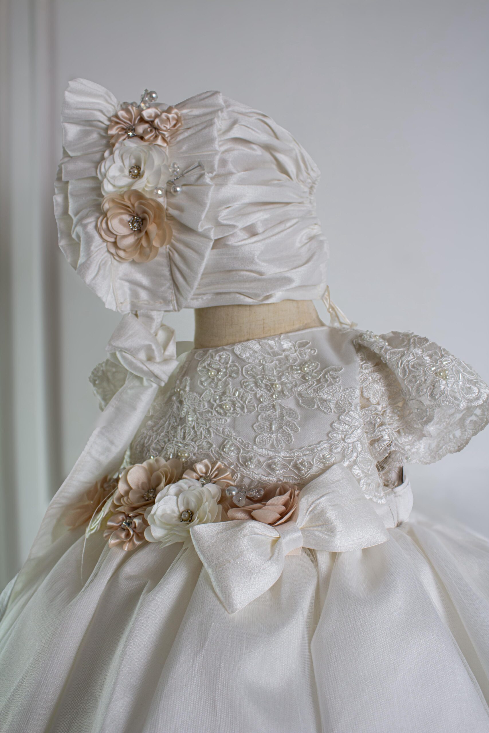 Adornos: La cintura está elegantemente embellecida con un cinturón o faja de satén, adornado con un conjunto de flores de tela en tonos blanco, crema y rosa palo. Estas flores, a menudo centradas con perlas o pequeños detalles, se repiten delicadamente en la capota a juego.