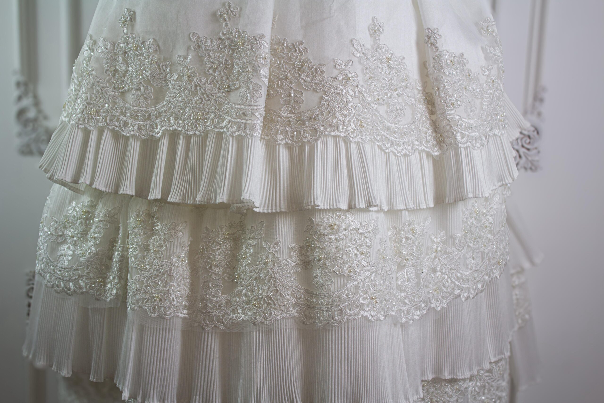 Material: Confeccionado en un tejido satinado blanco o marfil claro que sirve de base, cubierto por múltiples capas de organza, tul o tejidos plisados. La prenda está ricamente adornada con elaborados apliques de encaje que incorporan pequeñas lentejuelas o cuentas brillantes.