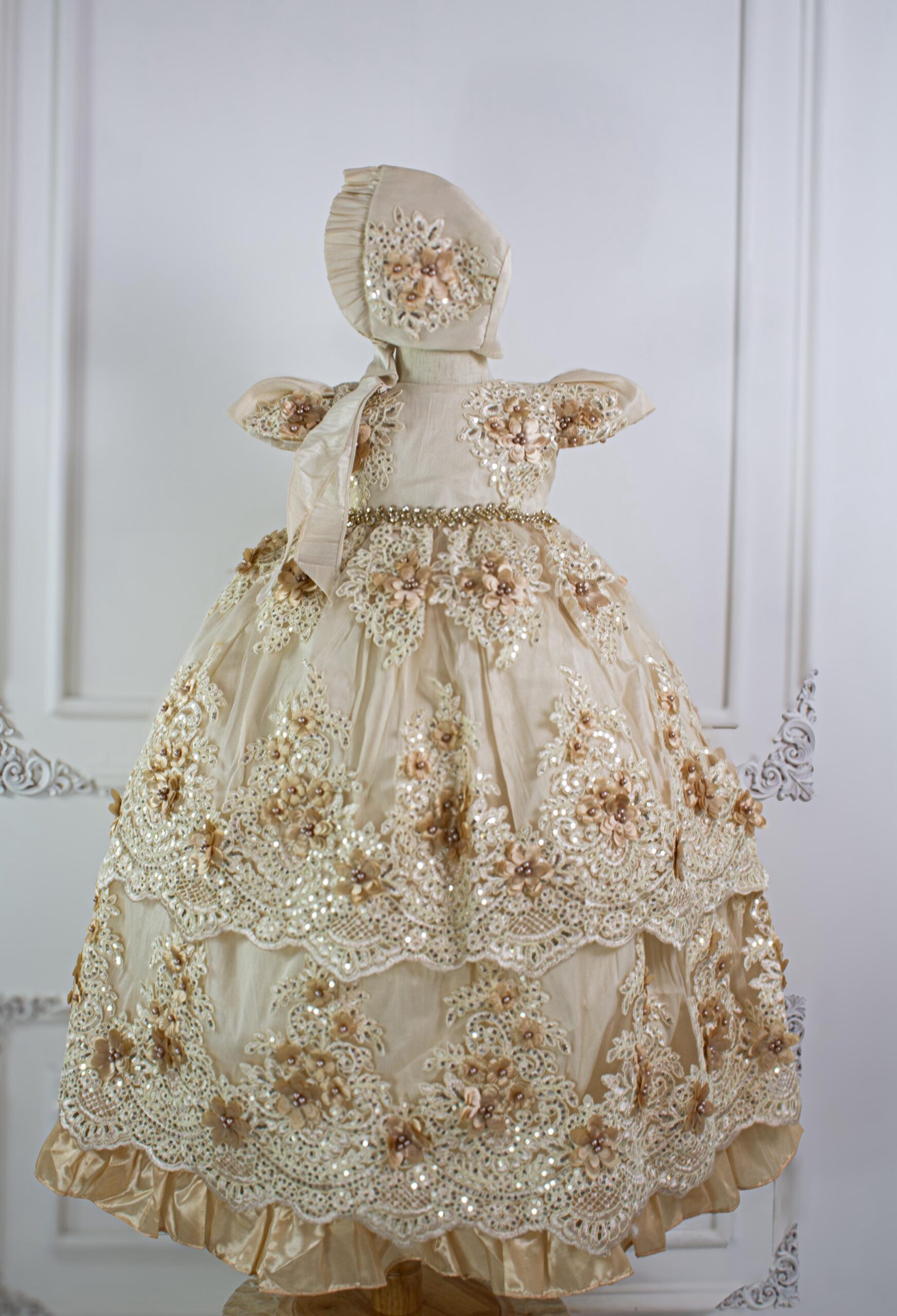 Un ropón de bautizo de estilo principesco y sumamente ornamentado, que irradia un lujo opulento. La densa aplicación de flores, encaje y lentejuelas sobre un tejido en tono champán lo convierte en una pieza deslumbrante.