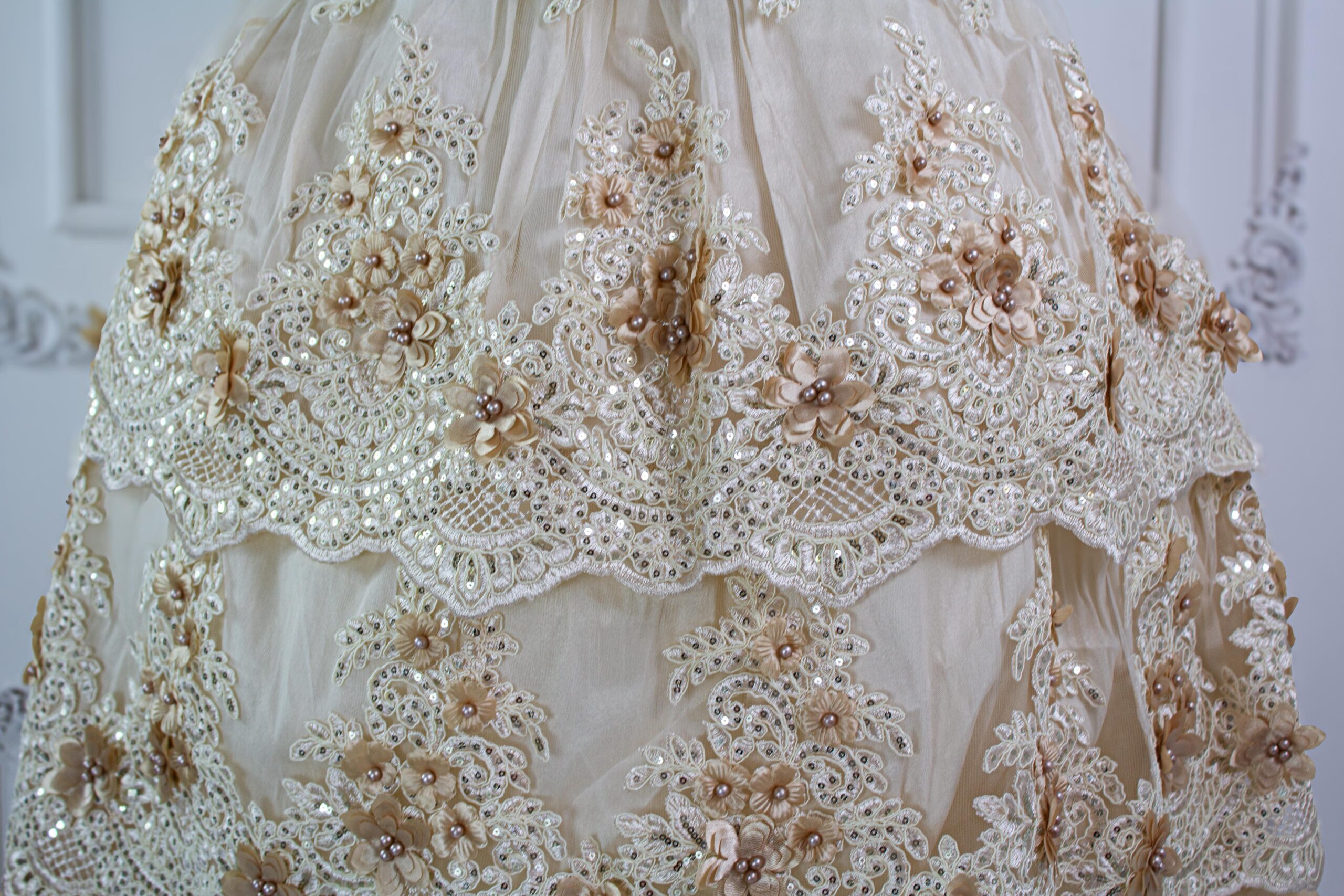 Material: Confeccionado en un rico tejido de satén o seda en un tono cálido, como marfil tostado, nude o champán. Está totalmente cubierto por una profusión de aplicaciones tridimensionales, incluyendo encaje, flores de tela, perlas y lentejuelas brillantes.