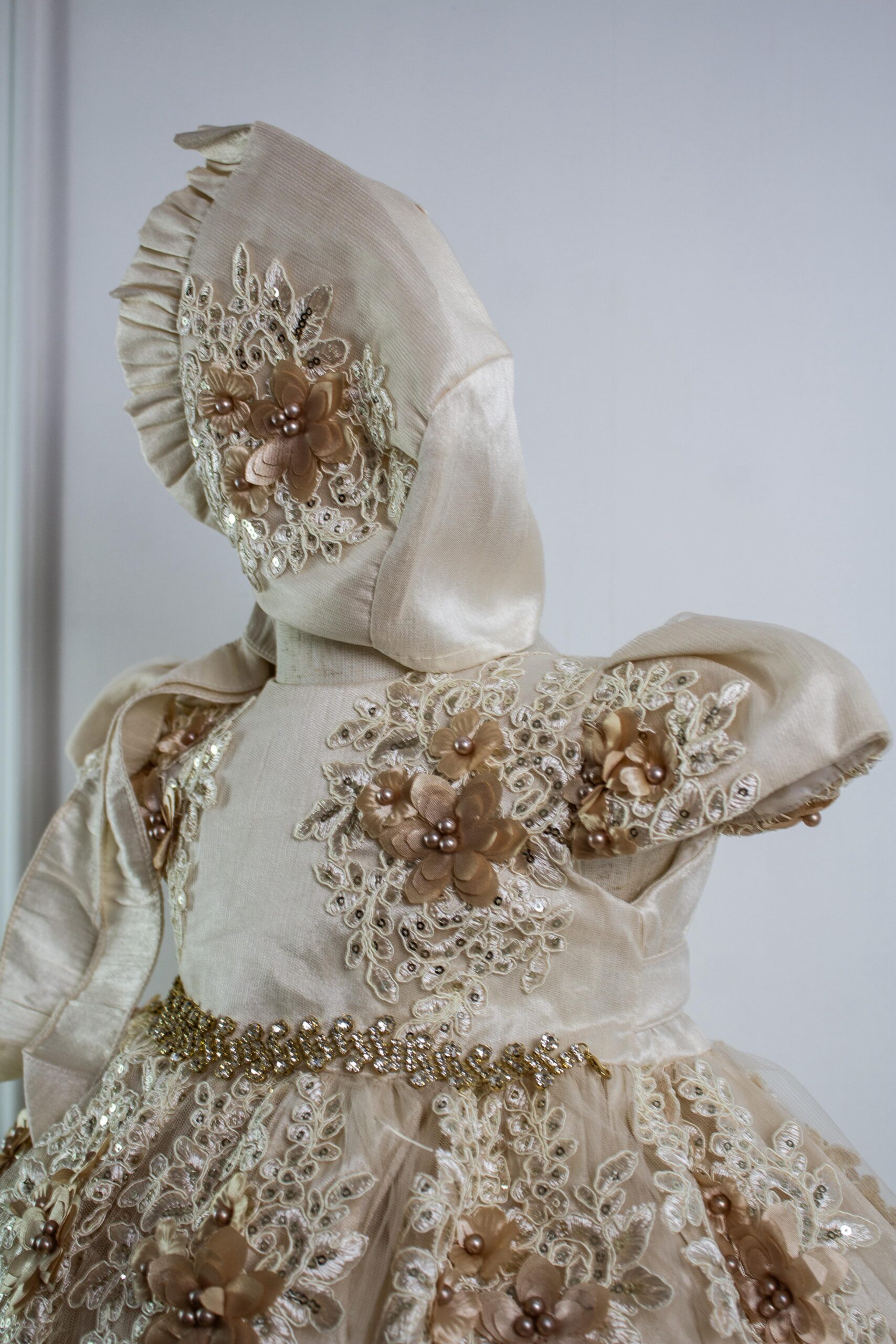 Adornos: La cintura está marcada con una fina faja de cuentas o pedrería brillante que simula un cinturón. El vestido y la capota están adornados con un sinfín de flores de tela en tonos crema, beige y rosa palo, realzadas por lentejuelas y cuentas. Una faja de satén en tono a juego se anuda al cuello de la capota.